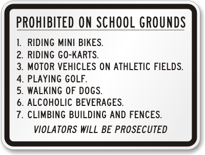 Use a "prohibited on school grounds, riding mini bikes, riding go-karts, motor vehicles on athletic fields, playing golf, walking of dogs, alcoholic beverages, climbing building or fences, violators will be prosecuted." sign. Signs improve safety.
