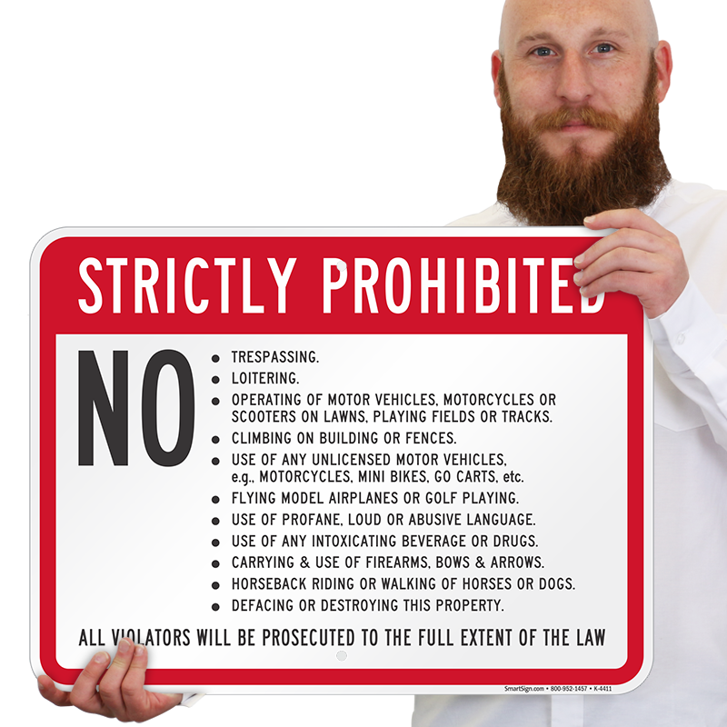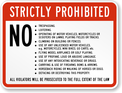 Property Rules Sign: Strictly Prohibited - No Trespassing, Loitering, Climbing On Building Or Fences. All Violators Will Be Prosecuted K-4411 Learn More...