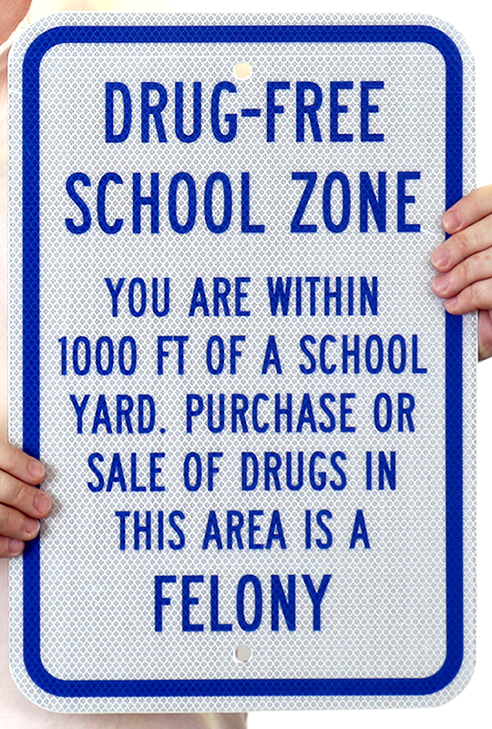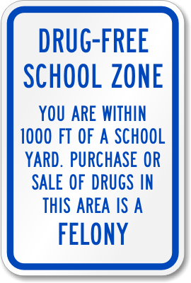 Drug Free School Sign: You Are Within 1000 Ft Of A School Yard. Purchase Or Sale of Drugs In This Area Is A Felony K-2431 Learn More...