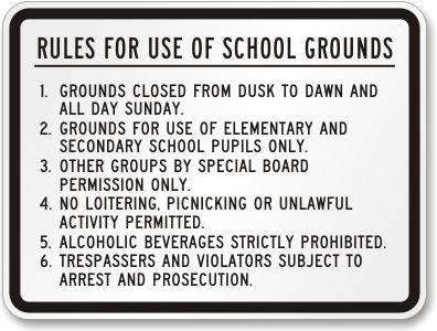Use a "rules for use of school grounds: grounds closed from dusk to dawn and all day sunday, grounds for use of elementary and secondary school pupils only, other groups by special board permission only, no loitering, picnicking or unlawful activity permitted ..." sign. Improve safety - with a sign!