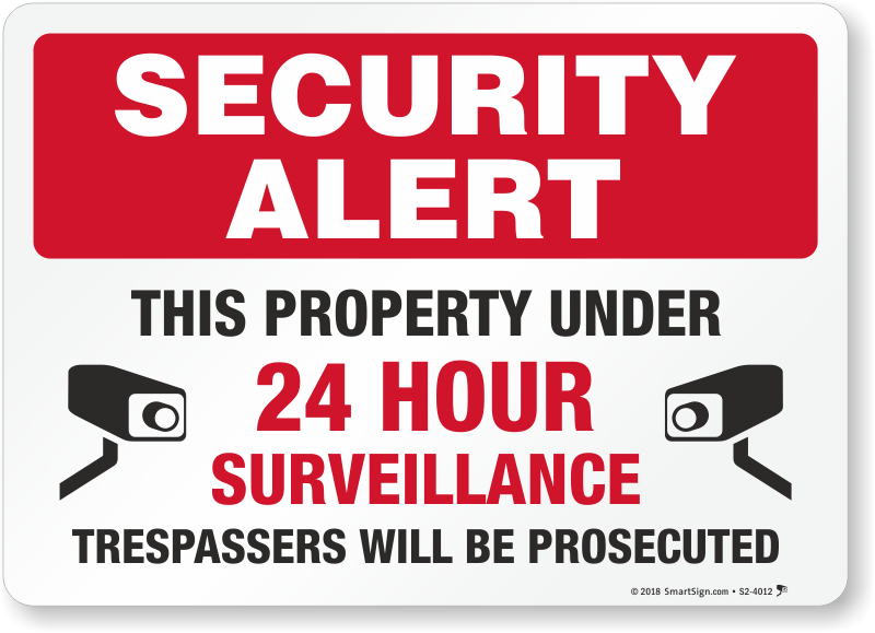 24 Hour Surveillance Sign: Security Alert - This Property Under 24 Hour Surveillance, Trespassers Will Be Prosecuted S2-4012