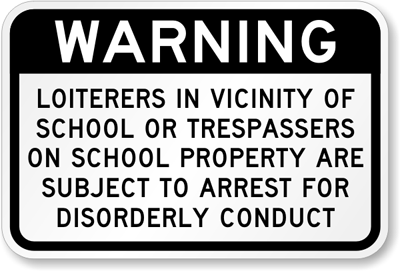 School Security Sign: Warning - Loiterers In Vicinity Of School Or Trespassers On School Property Are Subject To Arrest For Disorderly Conduct. K-4415 Learn More...