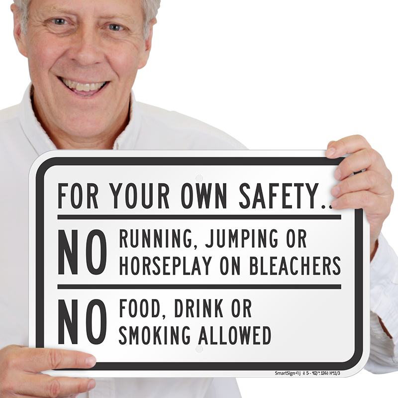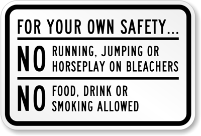 School Safety Sign: For Your Own Safety - No Running, Jumping Or Horseplay On Bleachers. No Food, Drink Or Smoking Allowed. K-4426 Learn More...