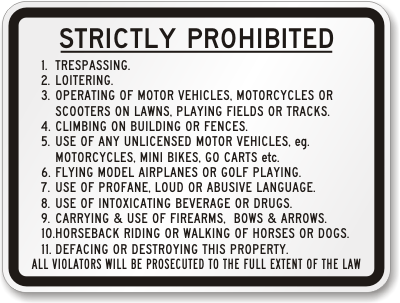 Prohibition Sign: Strictly Prohibited - Trespassing, Loitering, Operating Of Motor Vehicles, Motorcycles Or Scooters On Lawn, Playing Fields Or Tracks K-2998 Learn More...