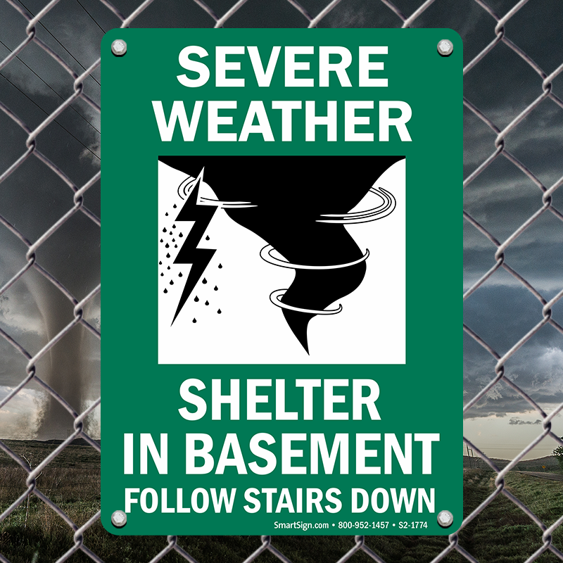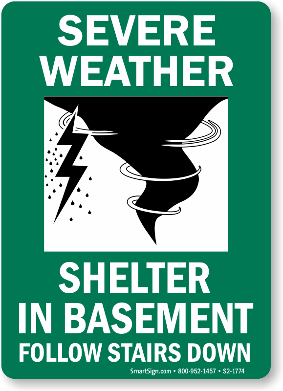 Shelter Area Sign: Severe Weather Shelter In Basement Follow Stairs Down S2-1774