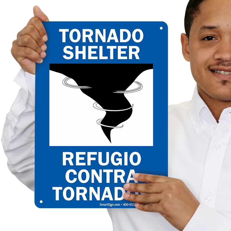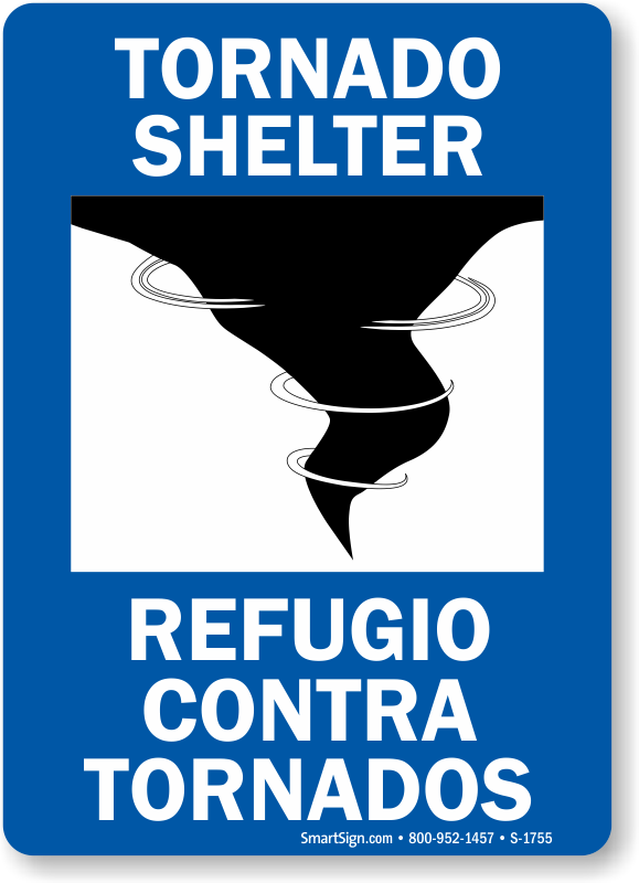 Meet fire safety compliance guidelines. Use a "tornado shelter " bilingual sign. Make information available.