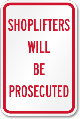 Signs provide a round-the-clock warning that shoplifting is a crime.