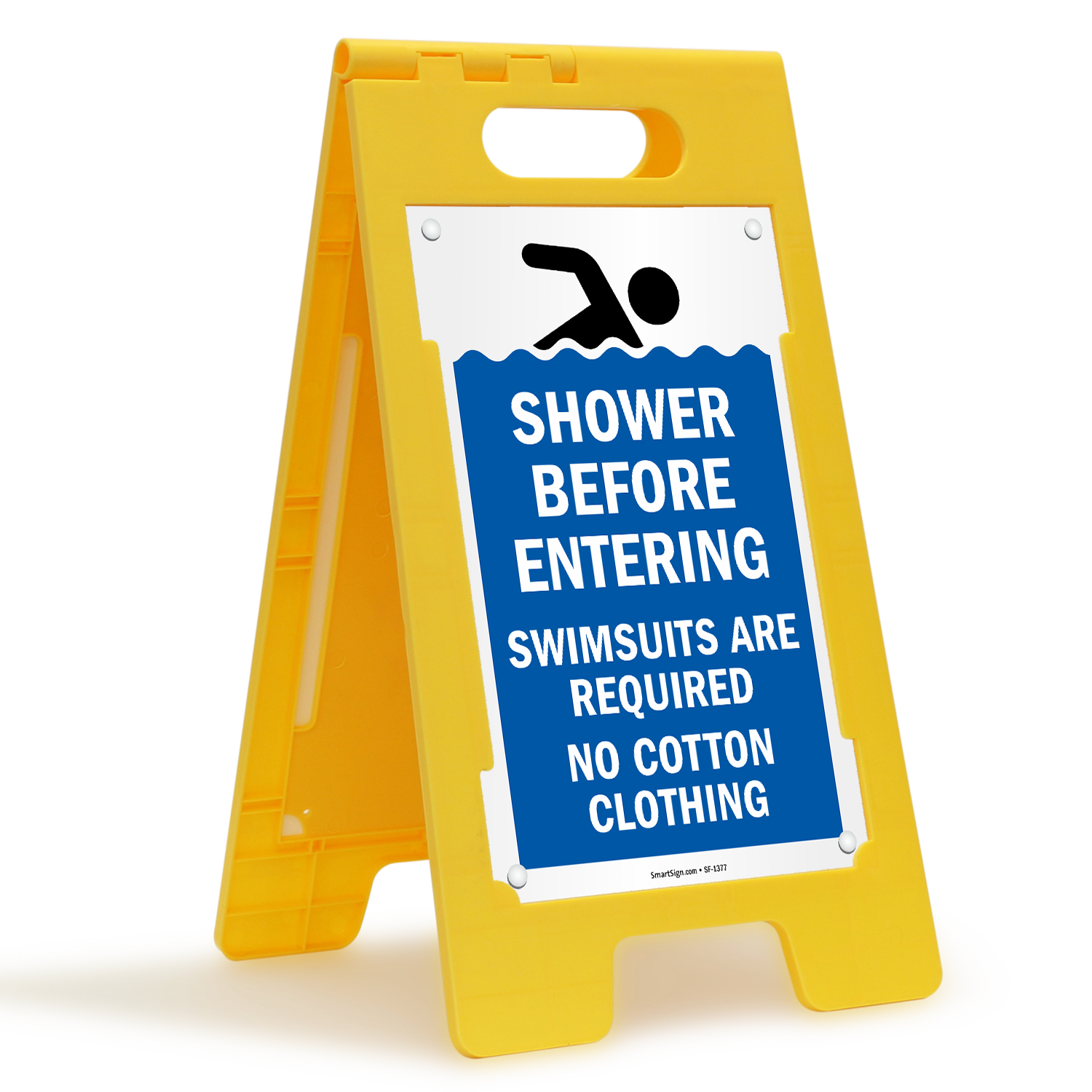 FloorBoss Standing Floor Sign: Shower Before Entering, Swimsuits Are Required No Cotton Clothing SF-1377