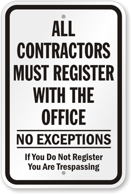 Visitors Must Register Sign: All Contractors Must Register With The Office, No Exceptions, If You Do Not Register You Are Trespassing K-9268 Learn More...