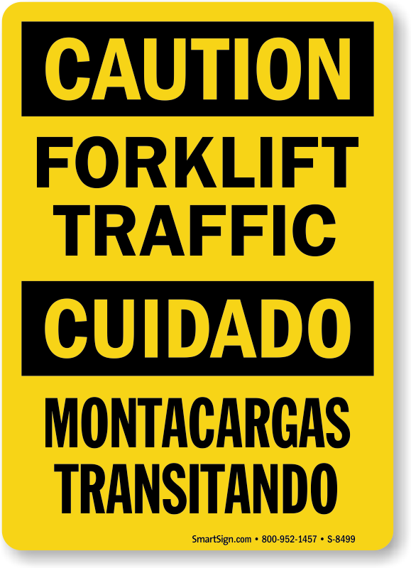 Road traffic includes all vehicles including forklifts. Inform drivers of the potential; combustion with a Caution Forklift Traffic Bilingual safety sign.