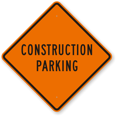 This black on orange diamond-shaped sign willl let construction vehicles know where to find designated parking with simple lettering and a clean black border.