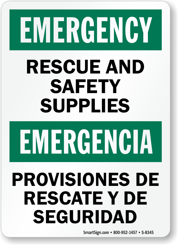 Label your emergency rescue and safety supplies adequately with a visible, bilingual sign. Bilingual signs send your message across clearly so everyone knows the rules and the correct safety procedures.