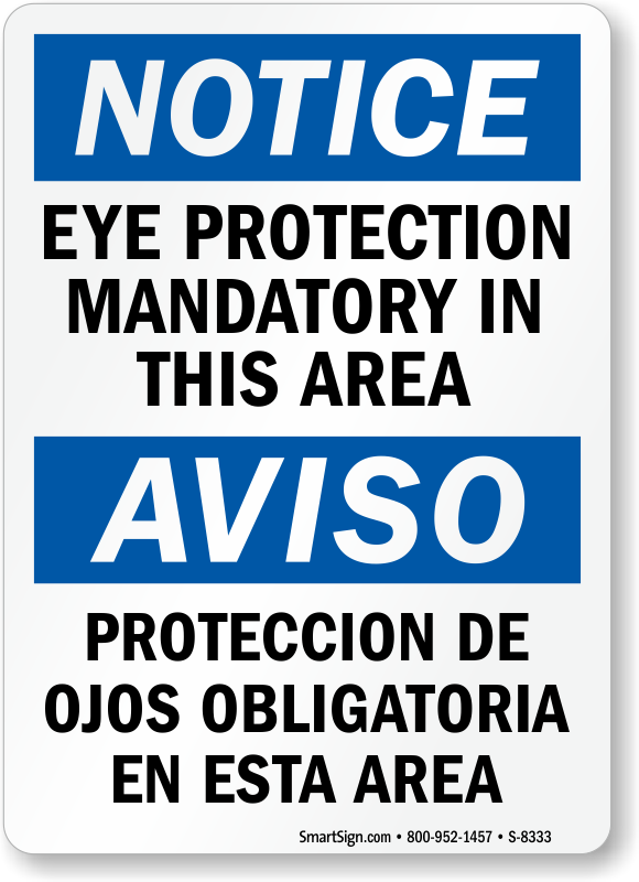 Protect your workers' eyes with this Eye Protection Required sign. Notice headers grab attention while English and Spanish text make the message on this sign clear.