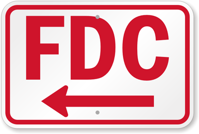 - 12" x 18" size sign features FDC in 6" letter height to comply with IBC regulation.