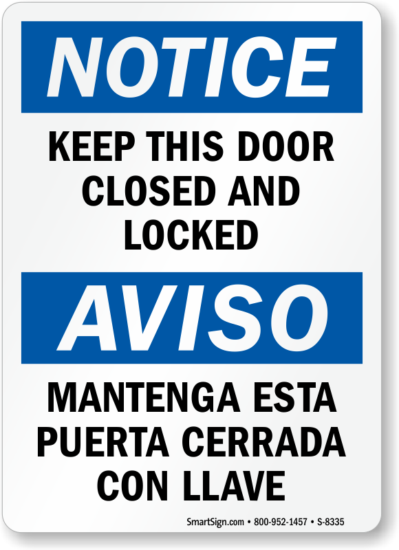 Without a sign, no one would know that important doors must be kept closed and locked. Notice headers grab attention while English and Spanish text make the message on this sign clear.