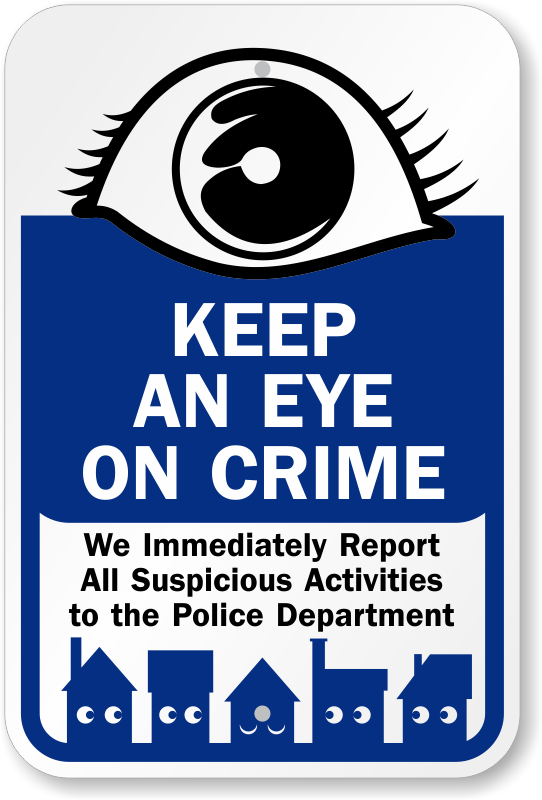 Neighborhood Crime Watch Sign: Keep An Eye On Crime, We Immediately Report All Suspicious Activities To Police Department K-9123 Learn More...