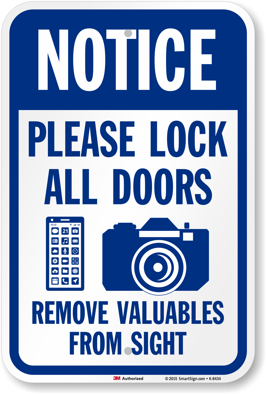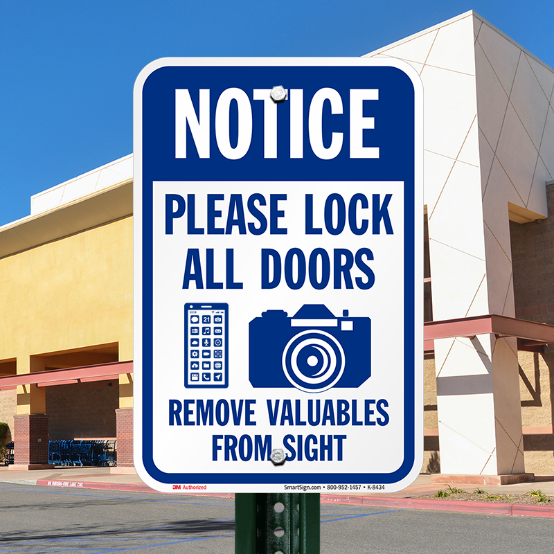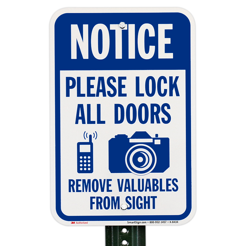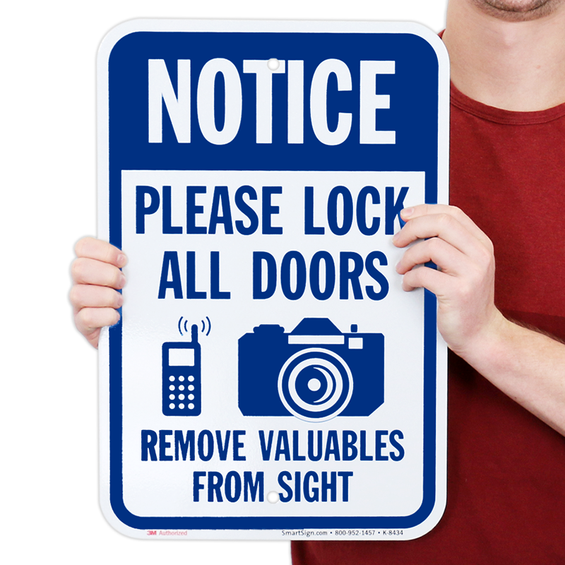 Notice Sign: Notice: Please Lock All Doors Remove Valuable From Sight (with Cell Phone and Camera Graphic) Learn More...