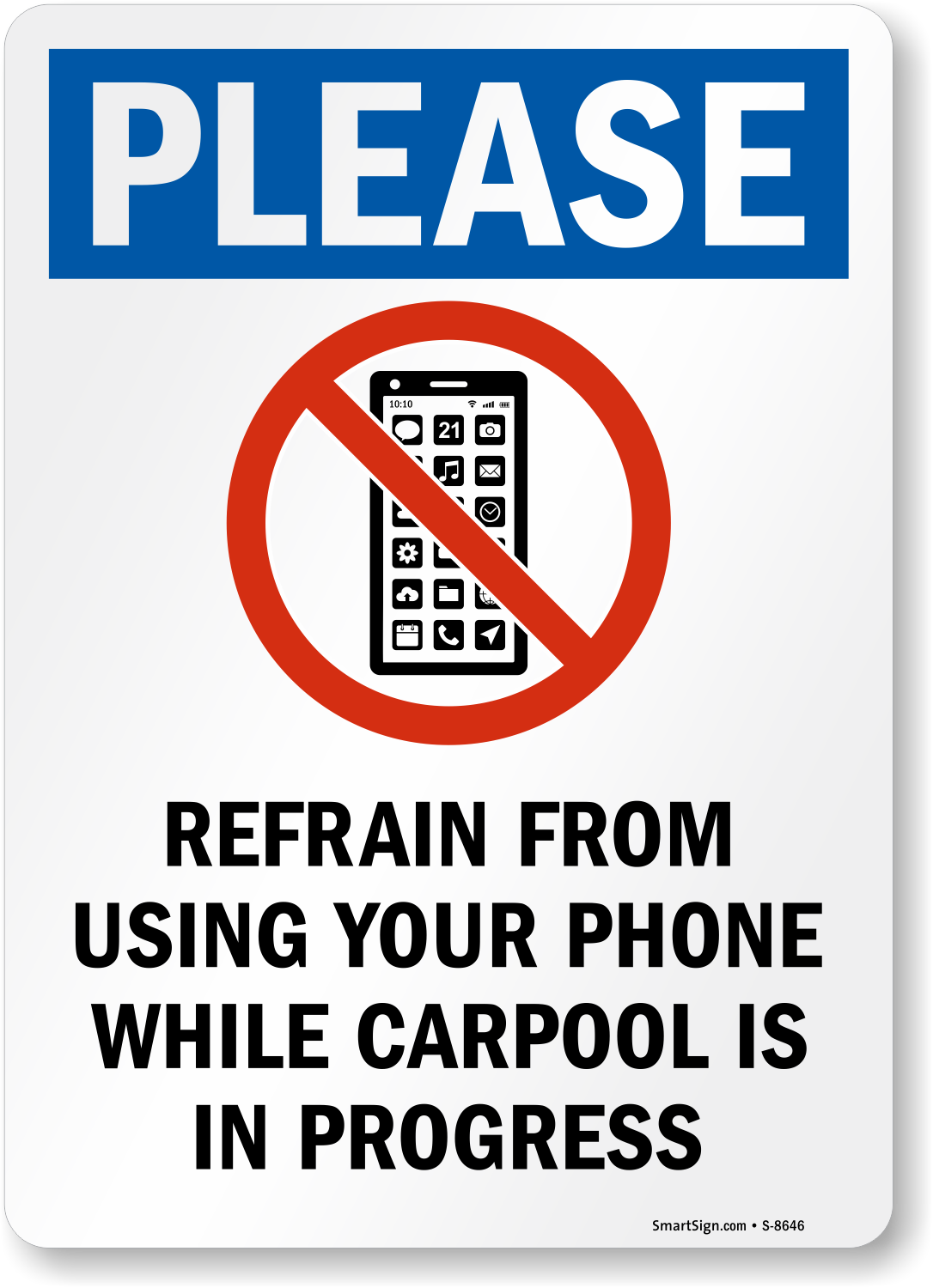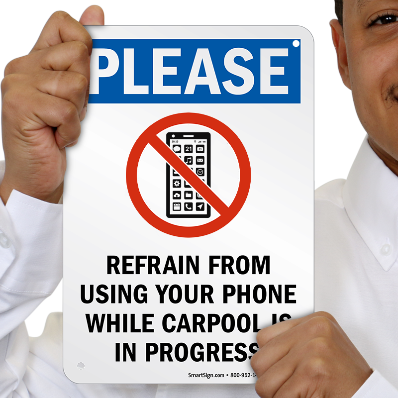 No Cellphone Sign: Please: Refrain From Using Phone While Carpool Is In Progress (with cell phone Graphic) S-8646