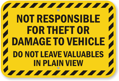 Parking Lot Security Sign: Not Responsible For Theft Or Damage To Vehicle Do Not Leave Valuables In Plain View K-8505 Learn More...