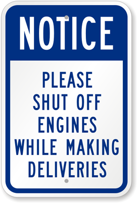 Notice Sign: Notice: Please Shut-Off Engines While Making Deliveries K-7878 Learn More...