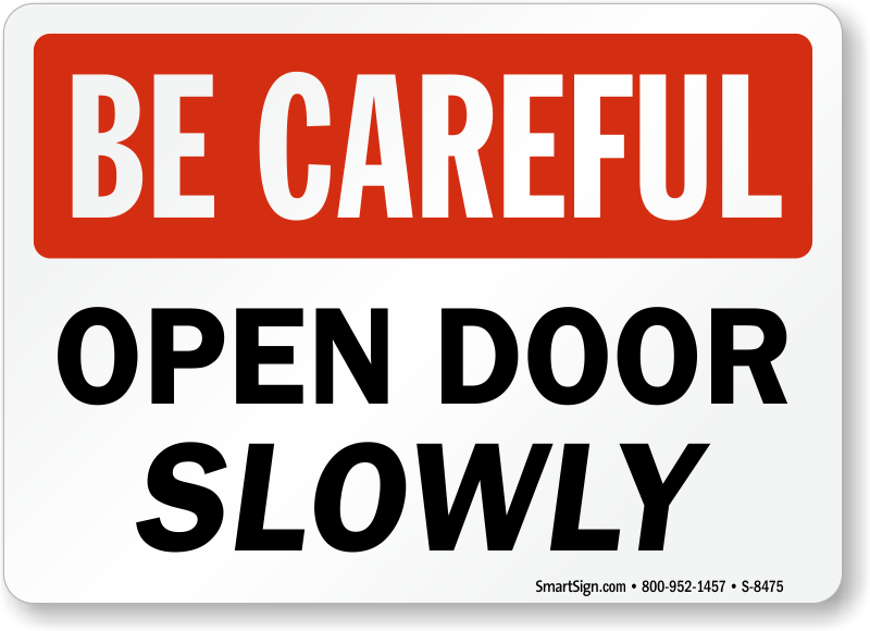 Remind people to take their time with an Open Door Slowly Sign. Be Careful Signs encourage safe practices.