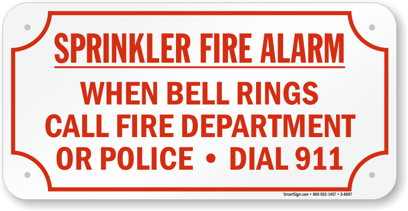 Sprinkler Fire Alarm Sign: Sprinkler Fire Alarm - When Bell Rings Call Fire Department Or Police. Dial 911 Learn More...