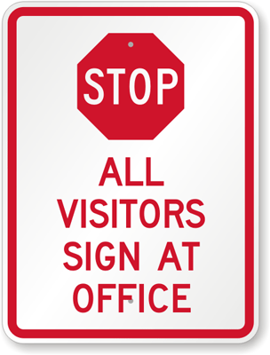 Visitors Must Register Sign: Stop - All Visitors Sign At Office K-9190 Learn More...