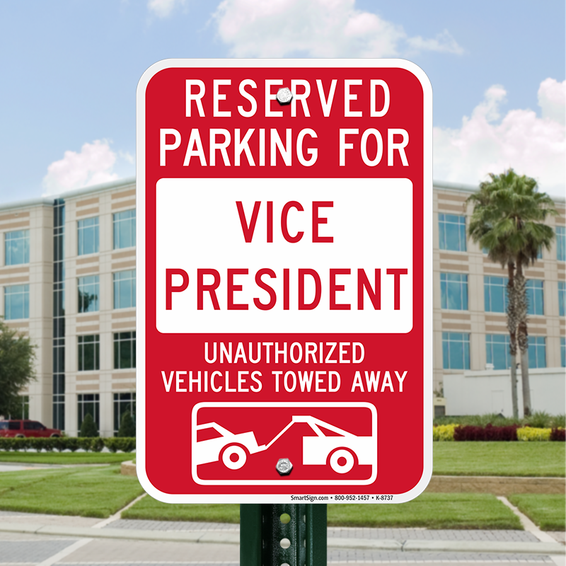 Reserved Parking Sign: Reserved Parking For Vice President, Unauthorized Vehicles Towed Away (with Car Tow Graphic) K-8737 Learn More...