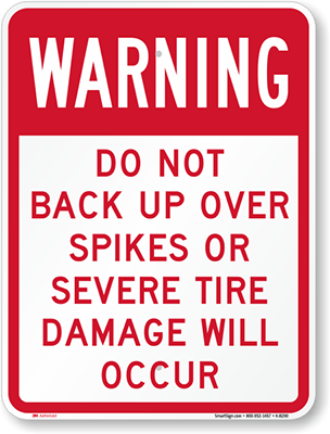 Warning Sign: Warning: Do Not Back Up Over Spikes Or Severe Tire Damage Will Occur