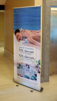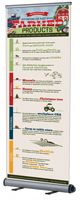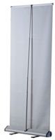 - The banner easily rolls into the base for storage and transport. A screwed-in pipe holds the poster firmly in place when displayed.