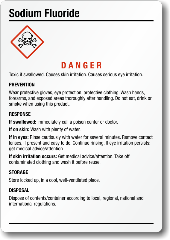 Sodium Fluoride GHS Label: Chemical Danger, Toxic If Swallowed, Causes Skin and Serious Eye Irritation with Prevention, Response, Storage and Disposal Instructions GHS-035-B Learn More...