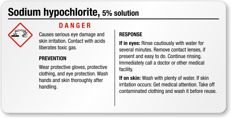 Your workers need to be alarmed with correct information while they deal with hazardous chemicals. A small Sodium Hypochlorite GHS Chemical Label helps you display the harmful effects, properties, and steps for immediate remedy of chemical.