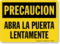 Address your Spanish speaking workers with this OSHA Caution sign and instruct them to open the door slowly.
