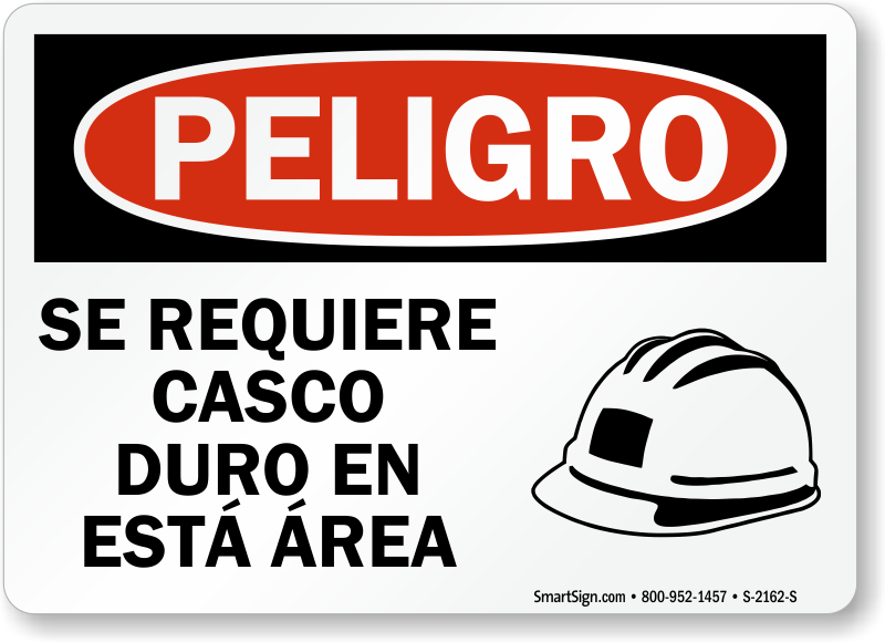 Here's a Hard Hat Sign completely in Spanish for all your Hispanic workers. OSHA compliant sign grabs attention with Peligro header and a graphic.