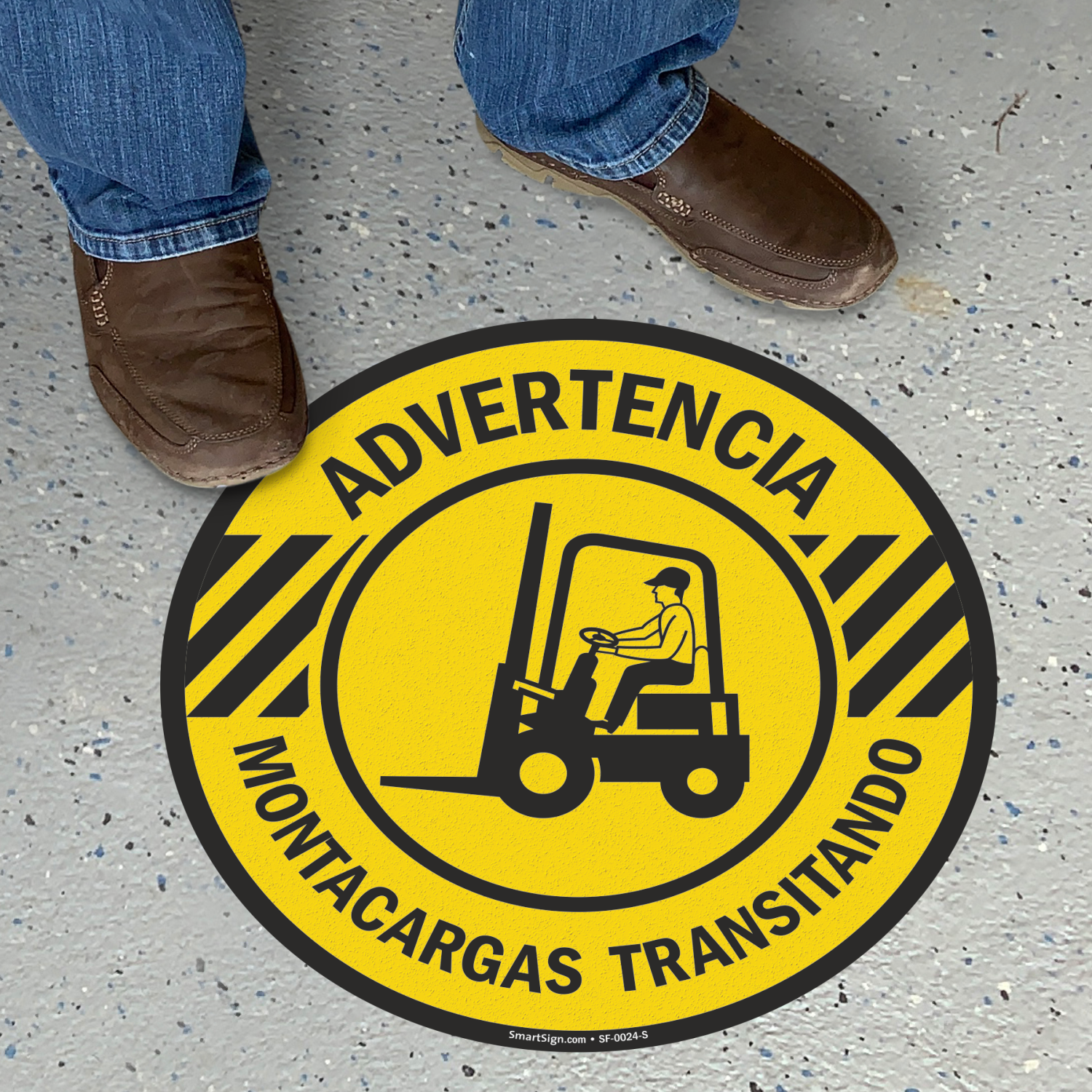 A SlipSafeâ„¢ Spanish floor sign is the best way to warn everybody of forklift traffic. This sign can't be missed because it is right under your nose.