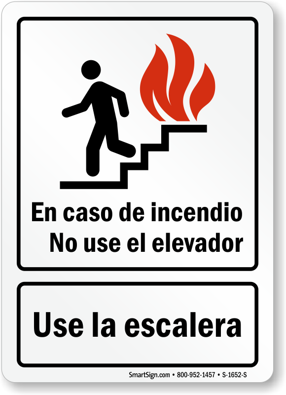 Prepare your Hispanic workers for emergency by instructing them in the language they understand. This Spanish sign with a graphic shows to use stairways in case of fire.