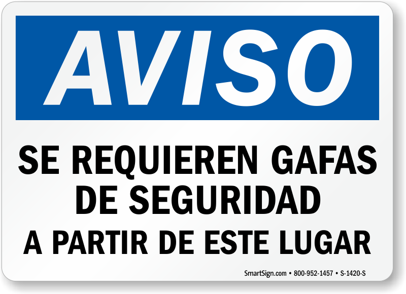 This OSHA Danger sign in Spanish will serve a reminder to your Hispanic workforce for wearing safety glasses beyond the area.
