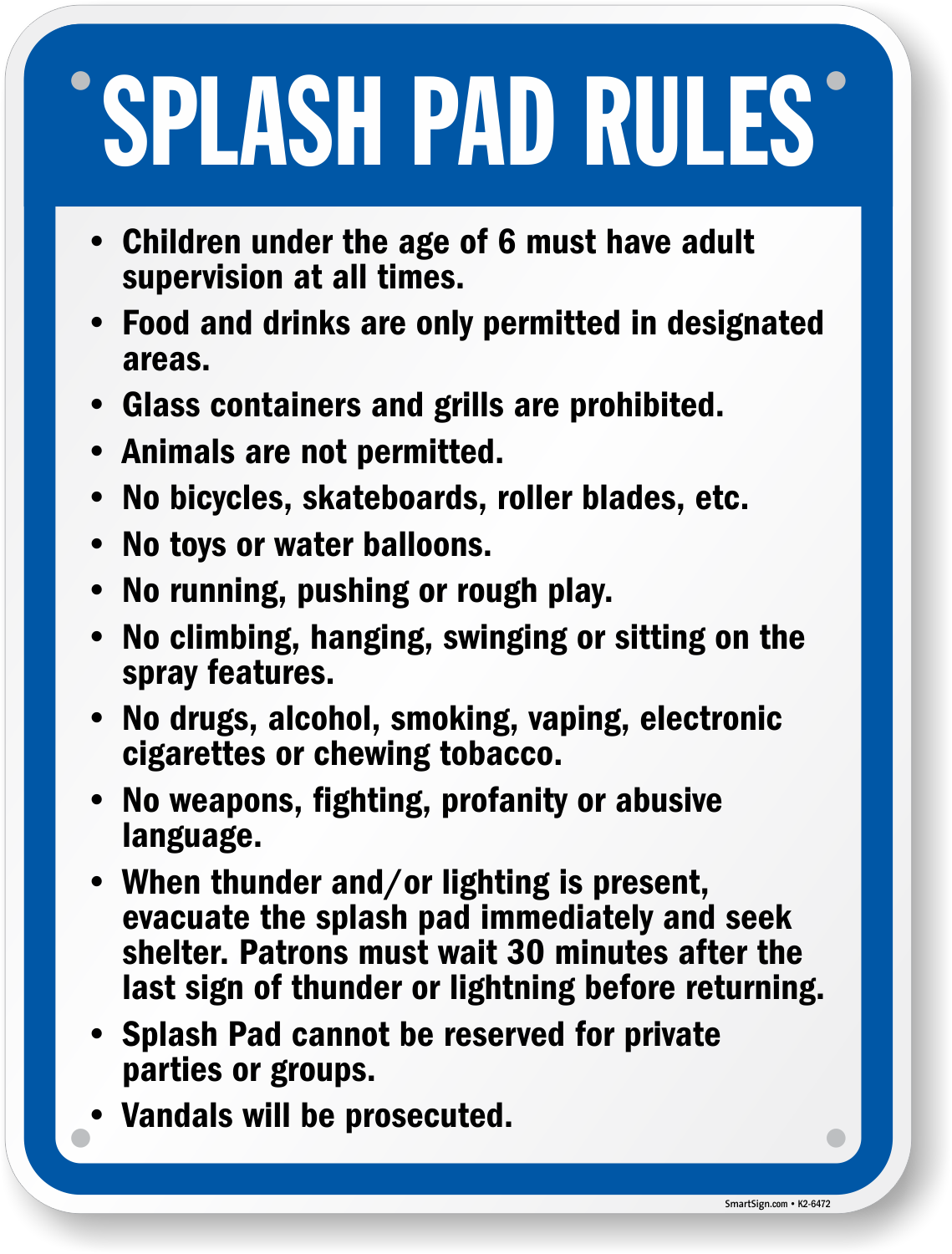 Spray Pool Rules Sign: Splash Pad Rules : Children Under The Age Of 6 Must Have Adult Supervision At All Times K2-6472 Learn More...