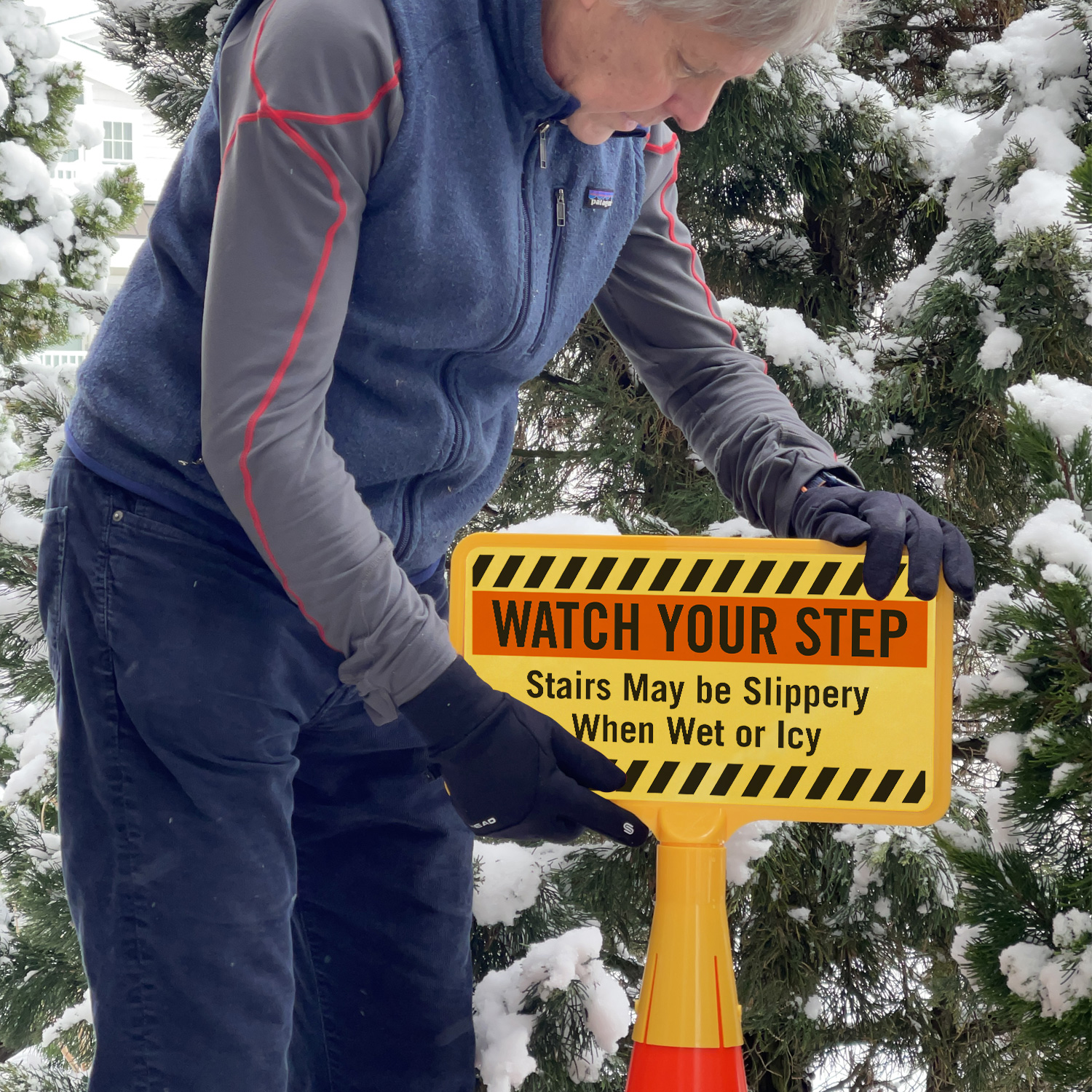 Prevent potential injuries caused by slip and fall hazards. Alert everyone to slippery stairs when wet or during icy conditions with this highly visible no-tip, portable Traffic Cone Sign.