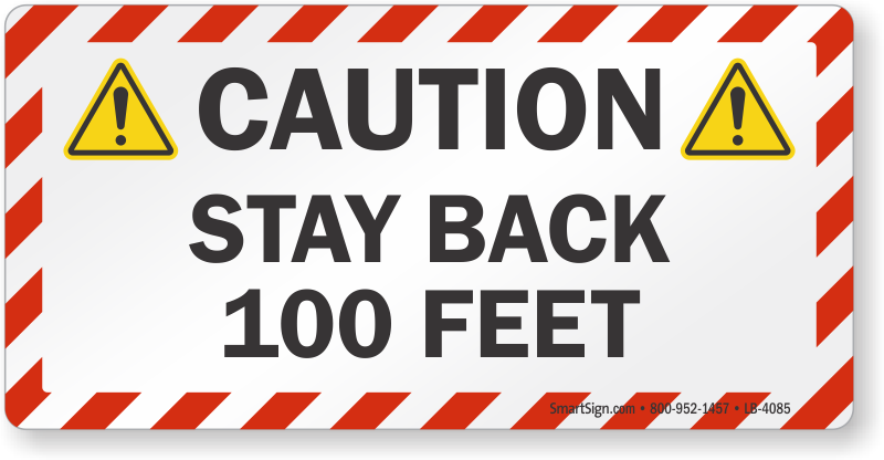 This 'Caution — Stay Back 100 Feet' Label with red and white striped border is hard-to-miss.