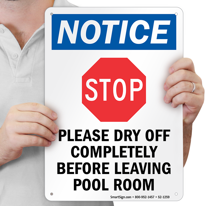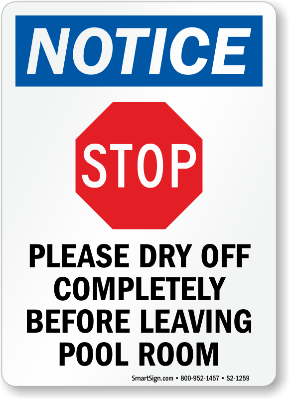 Remind pool users to dry off completely before leaving the pool area with this OSHA Notice Sign.