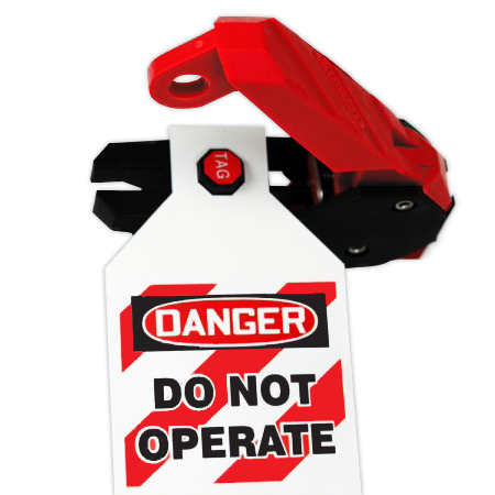 - The circuit breaker lockout is a visible safety red to call attention to the locked out switch.