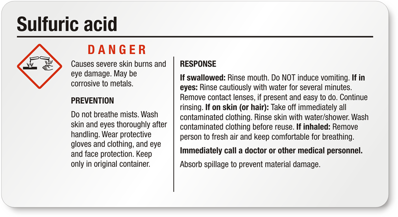 Protect your workers against Sulfuric Acid hazards. Our GHS Chemical Label consists of everything - signal word, pictograms, hazard and precautionary statements - pertaining to the chemical.