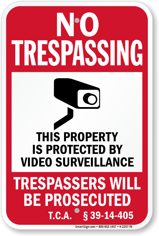 Tennessee No Trespassing Sign: This Property Is Protected By Video Surveillance, Trespassers Will Be Prosecuted – TCA § 39-14-405 K-2257-TN Learn More...