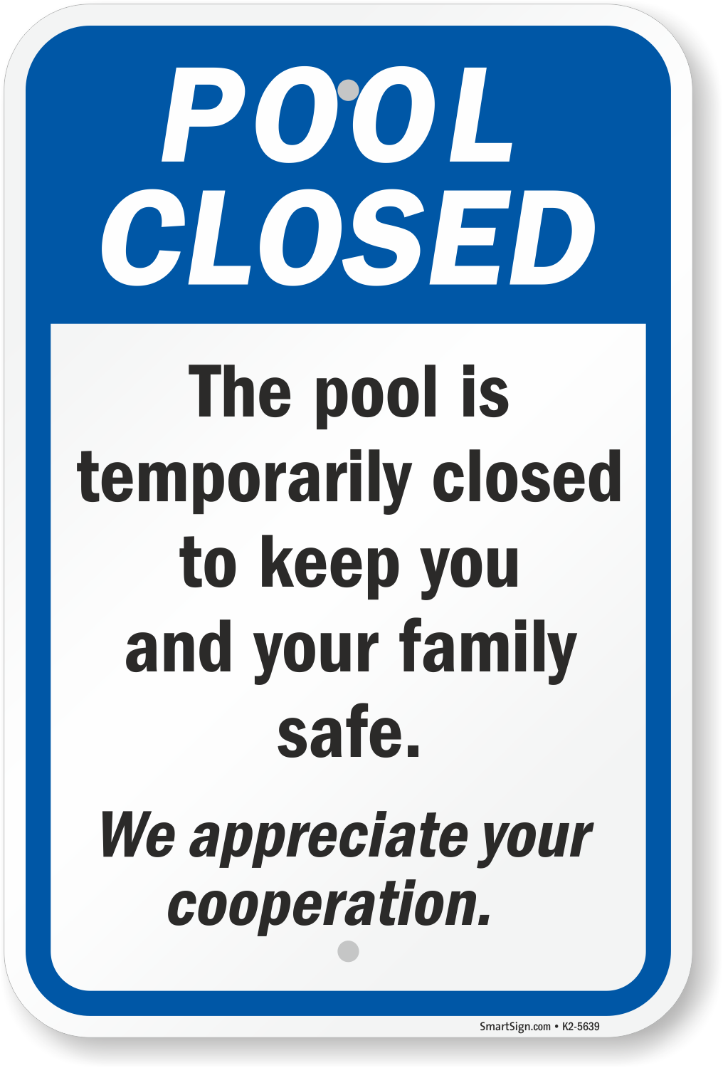 Pool Safety Sign: Pool Closed - The Pool Is Temporarily Closed To Keep You And Your Family Safe. We Appreciate Your Cooperation Learn More...