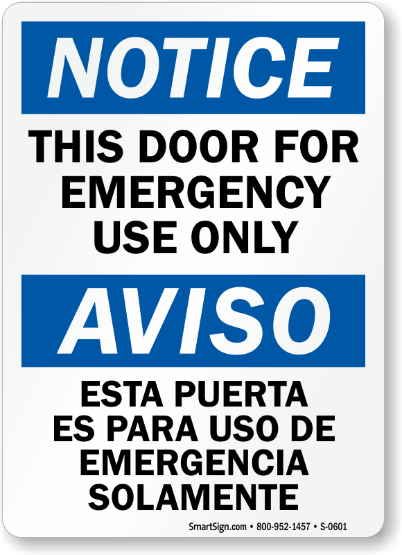 Indicate that the door is for emergency use only; install this high durability Bilingual OSHA Notice sign to keep everyone aware. Product resists moisture, abrasion, and chemical spills, thus keeping your message as good as new for years.