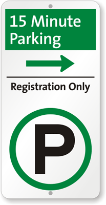 iParking Sign: 15 Minute Parking - Registration Only (with Parking Symbol and Right Arrow) I-0075-R Learn More...