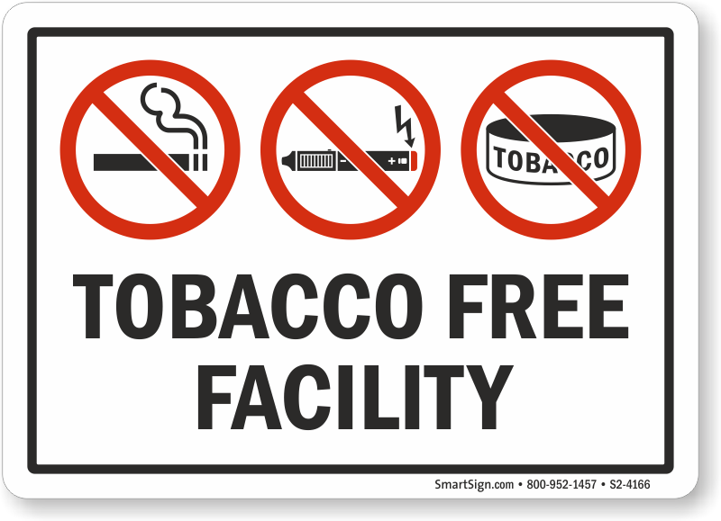 Tobacco Free Facility sign with symbols for all tobacco products makes sure no one is confused about which products are prohibited and which are not.