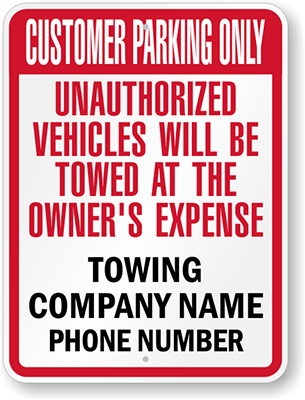 Custom Tow Away Sign: Customer Parking Only, Unauthorized Vehicles Will Be Towed At The Owner's Expense, Towing Co. Name, Phone Number