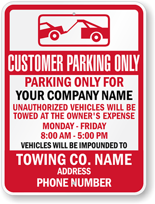Custom Tow Away Sign: Customer Parking Only, Parking Only For, Your Company Name, Unauthorized Vehicles Will Be Towed At The Owner's Expense, Monday - Friday 8:00 AM - 5:00 PM, Vehicles Will Be...